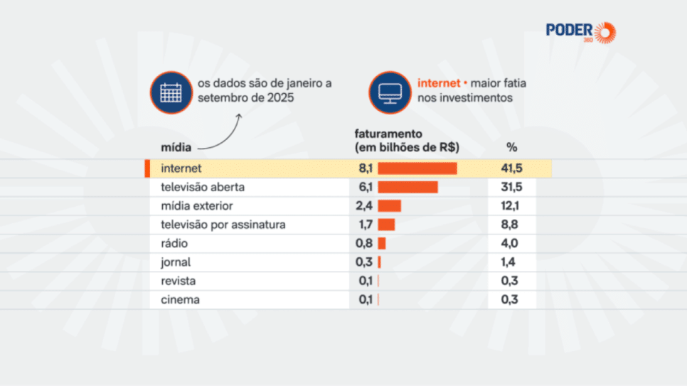 Um comparativo de dados de 2020 a 2025 revela um crescimento significativo no investimento em internet, que saltou de R$ 2,2 bilhões para R$ 8,1 bilhões – um aumento de 273,6%. Em contraste, o investimento em TV aberta cresceu 27% nesse mesmo período.