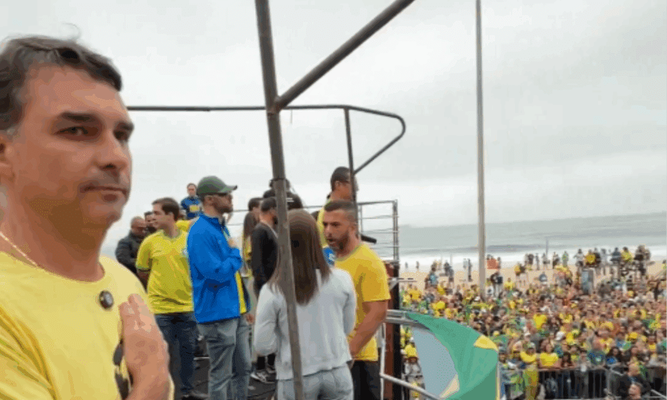 O senador Flávio Bolsonaro, conhecido como “01” pelo ex-presidente Jair Bolsonaro, participou da convenção de apoiadores realizada no domingo (7) na Praia de Copacabana, no Rio de Janeiro. Em vídeo divulgado nas redes sociais, Flávio, usando uma camiseta com o rosto do pai e a frase “Bolsonaro 2026”, afirmou que o grupo pretende “mostrar ao mundo que defende a liberdade”. Os manifestantes exibiram bandeiras dos Estados Unidos e faixas com mensagens contra o Supremo Tribunal Federal (STF).