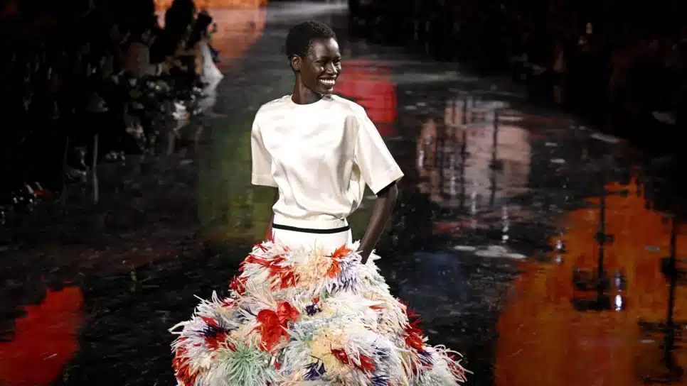 O conjunto final, uma saia volumosa e colorida que parecia ter sido feita com uma combinação de flores desfiadas e plumas, combinada com uma simples camiseta de seda, era alegre e frenético — assim como a plateia, que deu a Blazy uma ovação de pé quando ele saiu para seu primeiro agradecimento pela Chanel.