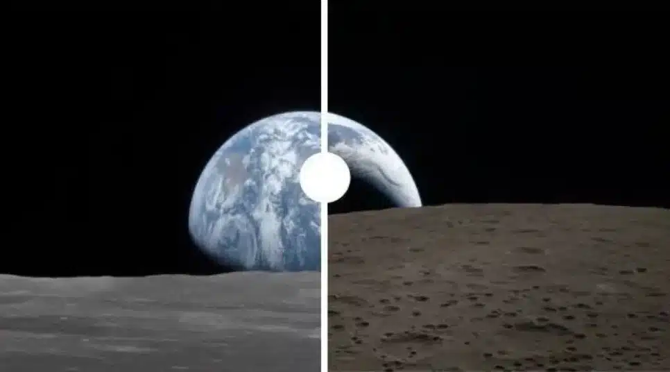 Outro comparativo notável envolve a foto da Apollo 8, datada de 1968. Nesta ocasião, o astronauta William Anders capturou um momento icônico: a Terra surgindo no horizonte, parecendo pequena, luminosa e isolada no vasto vazio.