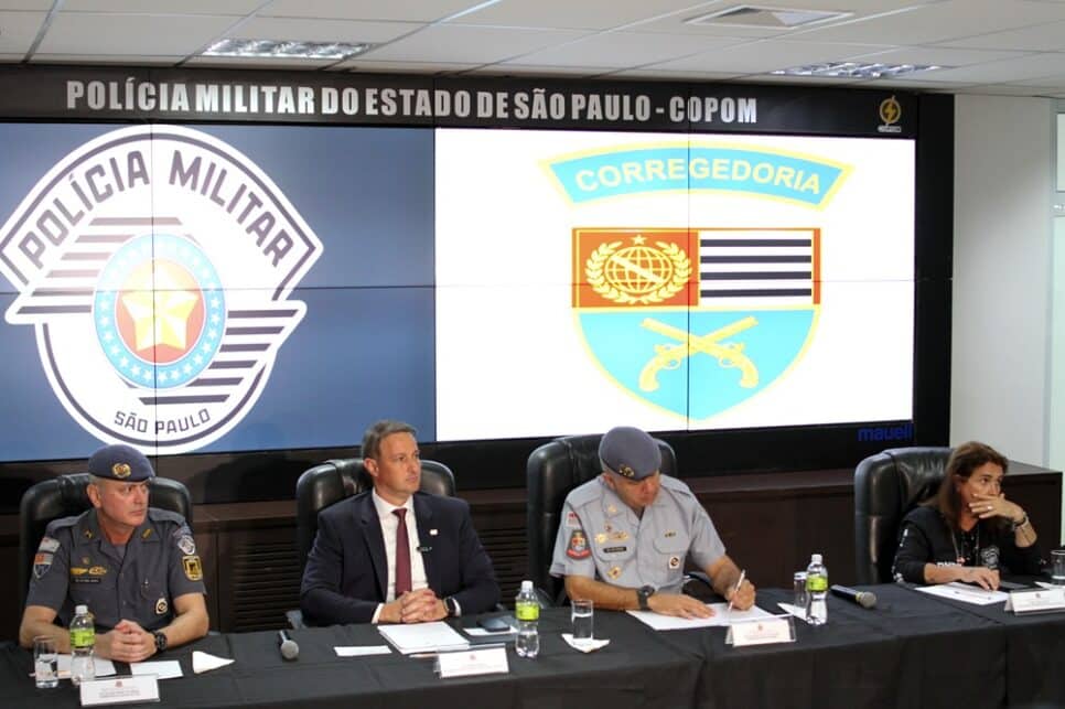 SP - DELATOR/PCC/EXECUÇÃO/OPERAÇÃO PRODOTES - GERAL - Coletiva de imprensa com o secretário da Segurança Pública de São Paulo, Guilherme Derrite (2ºe/d), e demais autoridades da secretaria sobre o assassinato do delator do PCC, Antonio Vinicius Lopes Gritzbach, na sede do Centro de Operações da Polícia Militar (Copom), no bairro da Luz, zona central da capital paulista, nesta quinta-feira, 16 de janeiro de 2025. Derrite afirmou nesta quinta-feira, 16, que o próximo passo da Força-Tarefa das polícias é descobrir quem mandou matar Antonio Vinicius Lopes Gritzbach. Nesta manhã, operação da Corregedoria prendeu um policial militar apontado como autor dos disparos que mataram Gritzbach, além de 14 policiais que atuavam ilegalmente na escolta do delator. O secretário afirmou que as investigações são sigilosas e que as identidades não serão reveladas. 16/01/2025 - Foto: RAUL LUCIANO/ATO PRESS/ESTADÃO CONTEÚDO