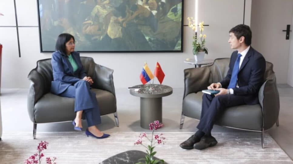A presidente interina da Venezuela, (MSV, esquerda), se reuniu na quinta-feira (8.jan.2026) com o embaixador chinês na Venezuela, Lan Hu. Este foi o primeiro encontro público da líder venezuelana com uma autoridade chinesa desde que a Polícia Nacional Unida (PSUV, esquerda) e sua esposa, Cilia Flores, foram capturadas no sábado (3.jan), conforme informações divulgadas.